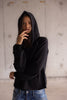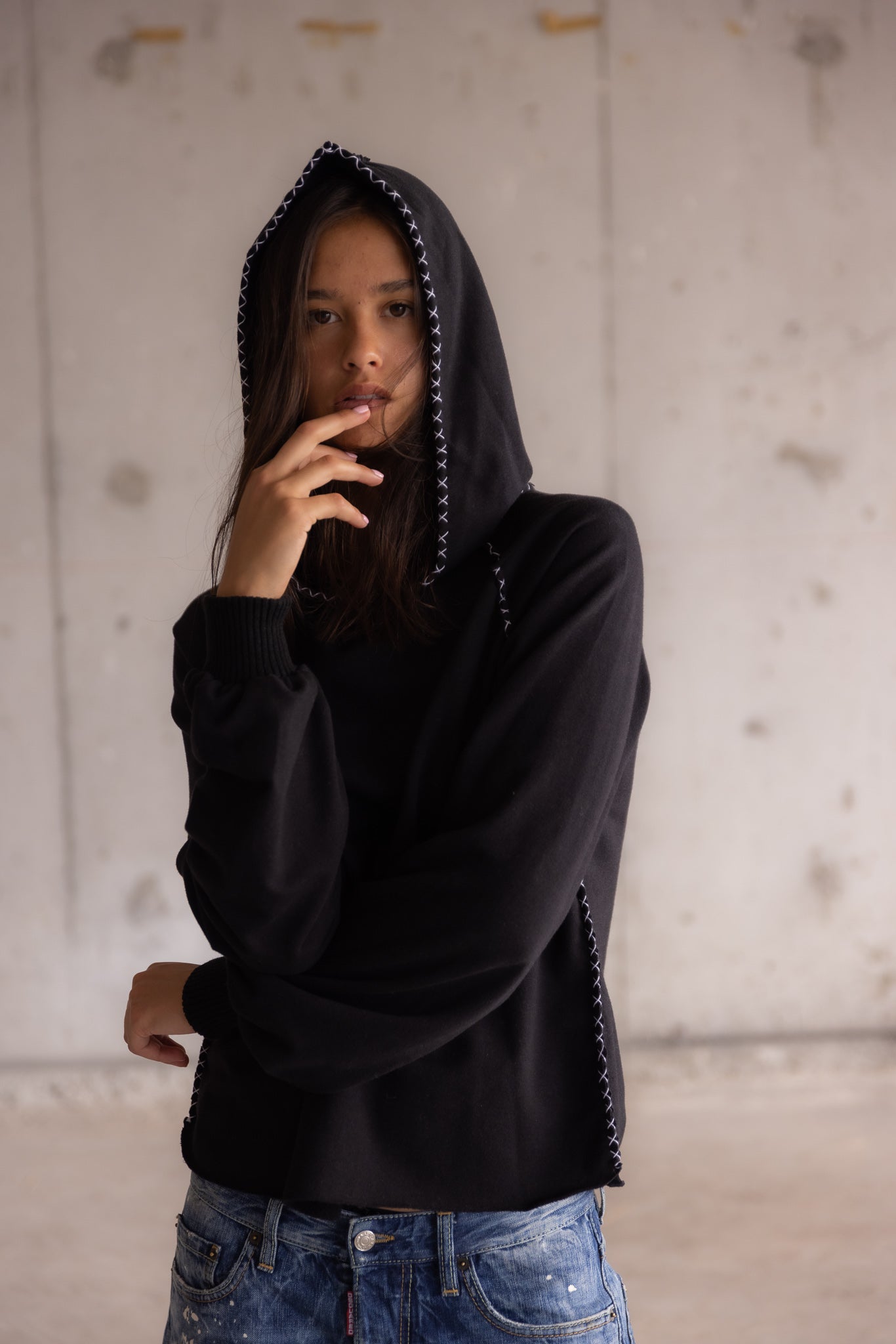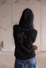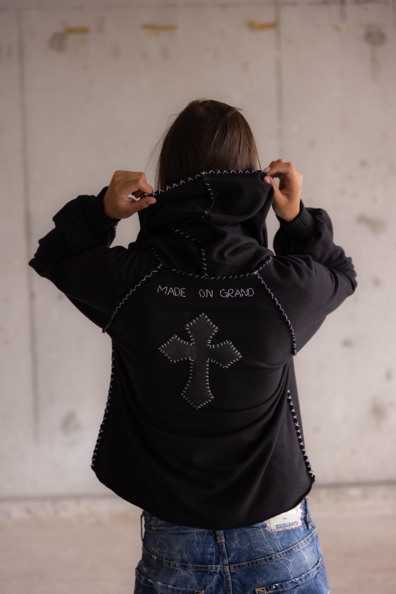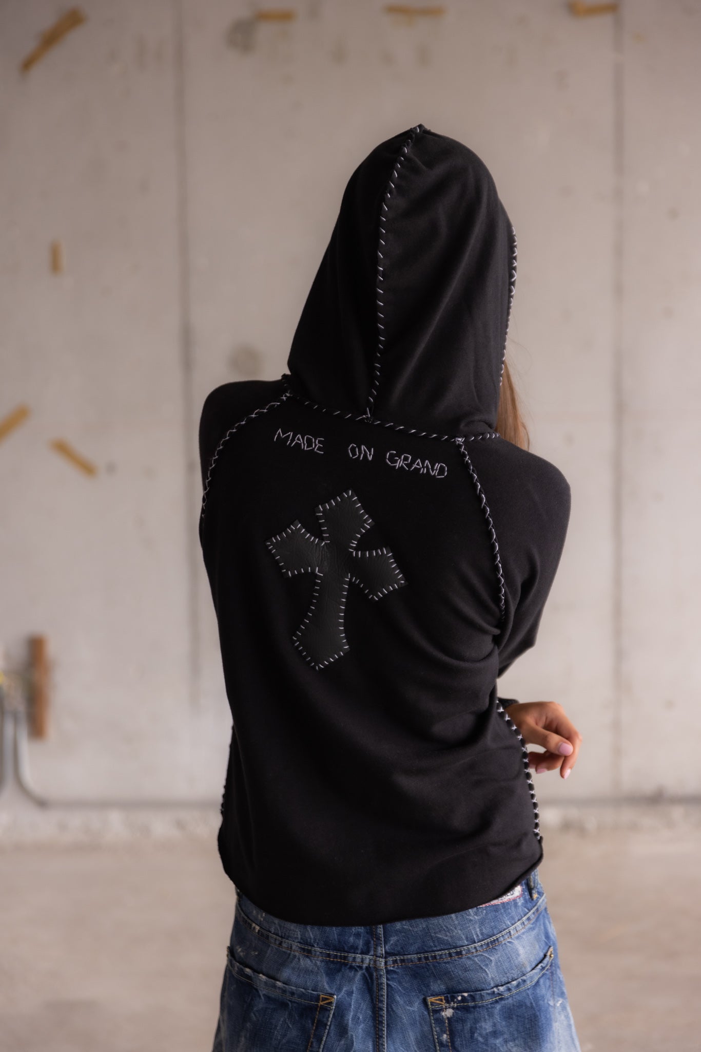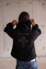 Handmade heavyweight black hooded sweatshirt with contrast stitching and cross appliqué.
