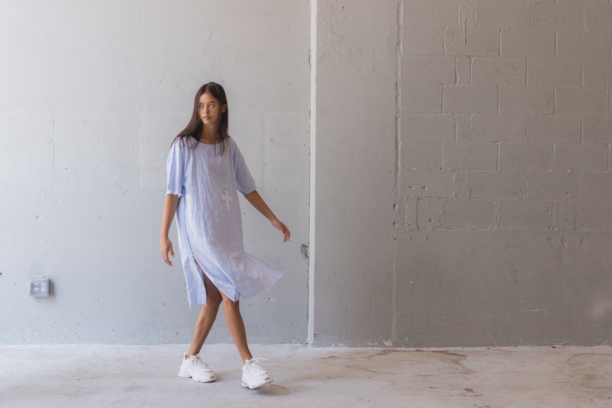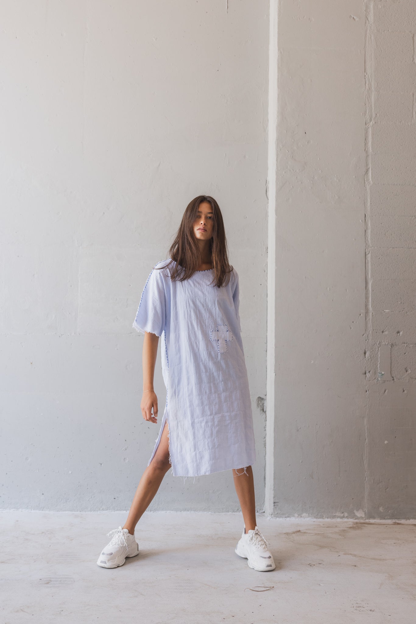 Handmade blue linen dress with contrast stitching and raw edges