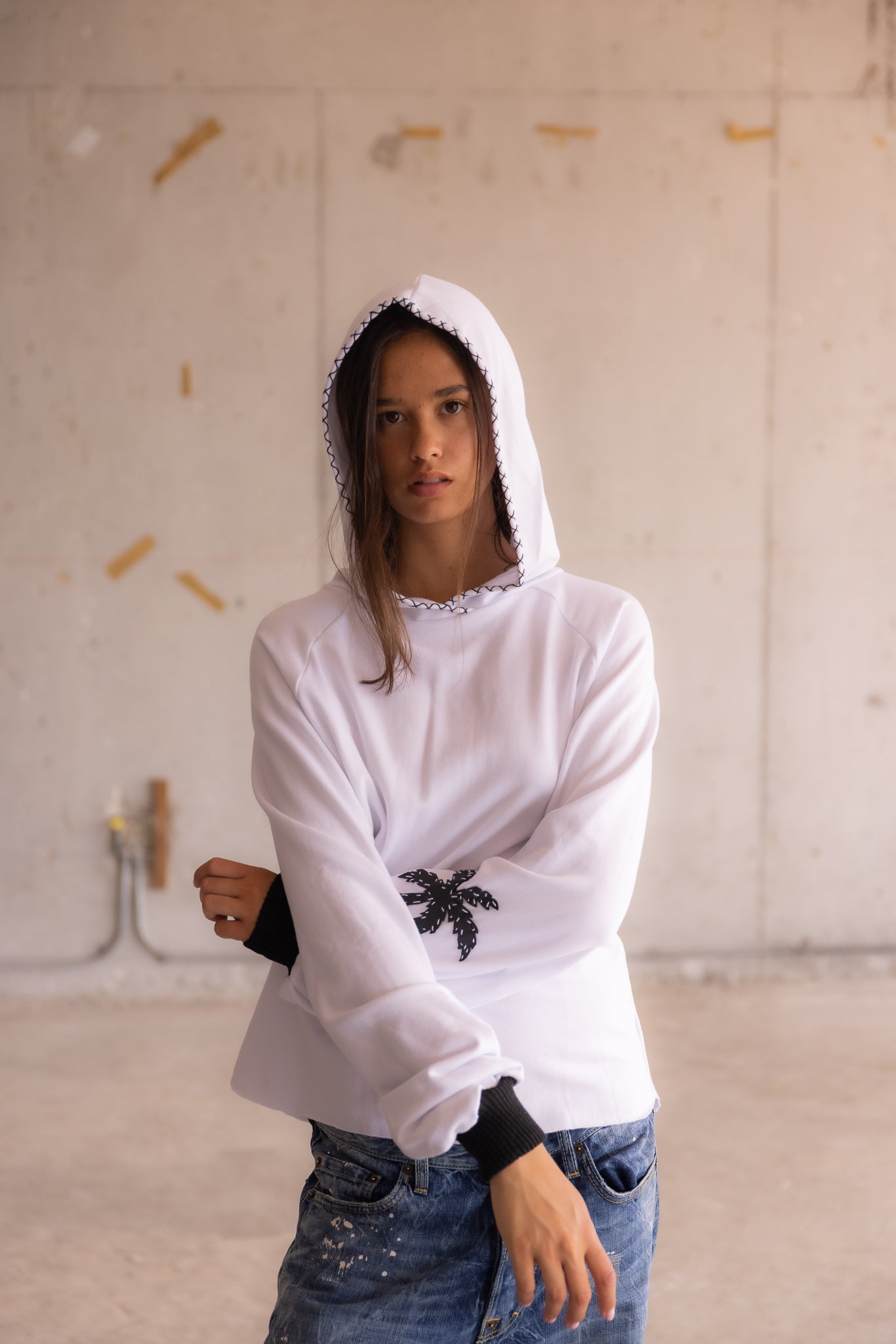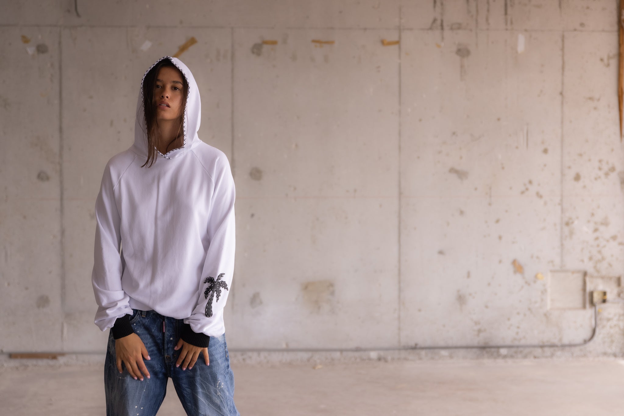 Handmade heavyweight white hooded sweatshirt with contrast stitching and palm tree appliqué.